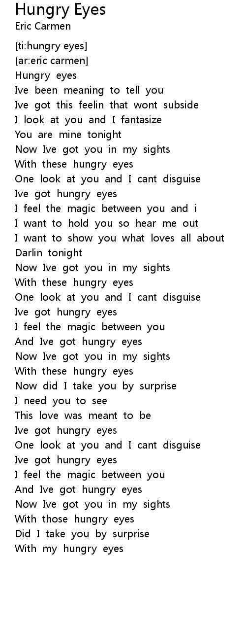 "Eric Carmen - Hungry Eyes (Lyrics)", Thanks for watching! Like, comment, share & subscribe for more!. This site is an open community for users to share their favorite images on the internet, all pic or pictures in this site are for personal picture use only, it is stricly prohibited to use this pics for commercial purposes, if you are the writer and find this pic is shared without your permission, please kindly raise a DMCA report to Us.